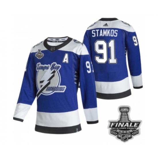 >Men's Adidas Lightning #91 Steven Stamkos Blue Home Authentic 2021 Stanley Cup Jersey