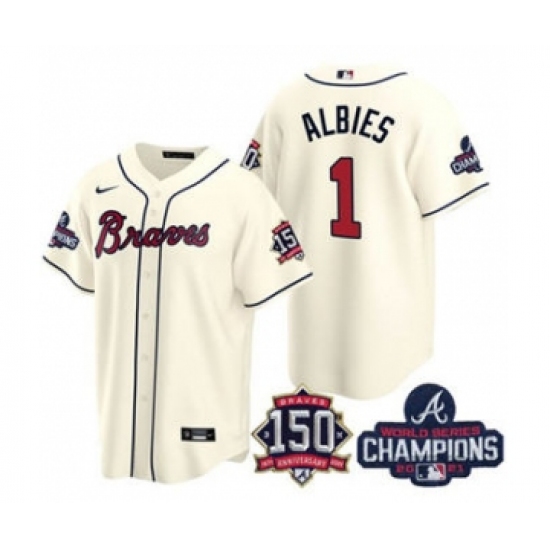 Men's Atlanta Braves #1 Ozzie Albies 2021 Cream World Series Champions With 150th Anniversary Patch Cool Base Stitched Jersey