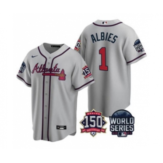 Men's Atlanta Braves #1 Ozzie Albies 2021 Gray World Series With 150th Anniversary Patch Cool Base Baseball Jersey