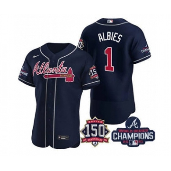 Men's Atlanta Braves #1 Ozzie Albies 2021 Navy World Series Champions With 150th Anniversary Flex Base Stitched Jersey