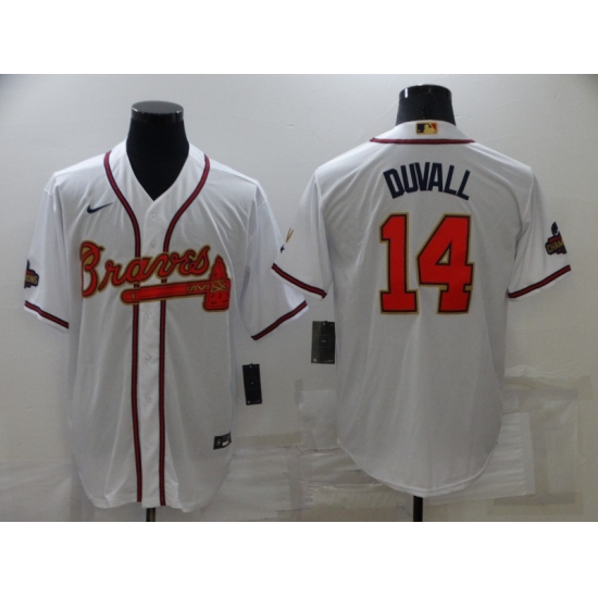 >Men's Atlanta Braves #14 Adam Duvall White 2022 Gold Program Authentic Player Jersey