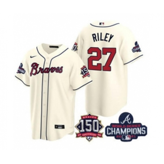 Men's Atlanta Braves #27 Austin Riley 2021 Cream World Series Champions With 150th Anniversary Flex Base Stitched Jersey