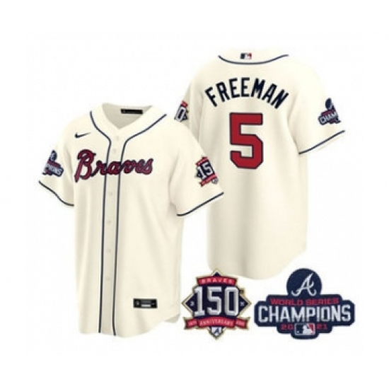 Men's Atlanta Braves #5 Freddie Freeman 2021 Cream World Series Champions With 150th Anniversary Patch Cool Base Stitched Jersey