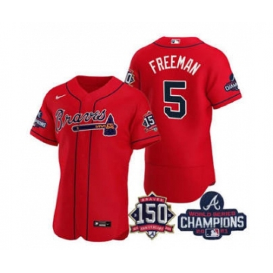 Men's Atlanta Braves #5 Freddie Freeman 2021 Red World Series Champions With 150th Anniversary Flex Base Stitched Jersey