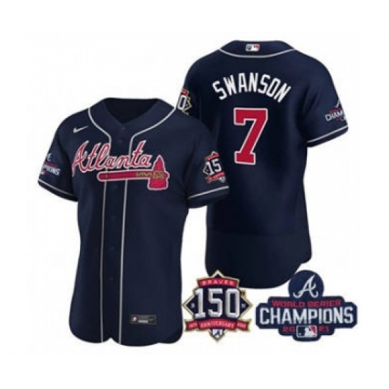 Men's Atlanta Braves #7 Dansby Swanson 2021 Navy World Series Champions With 150th Anniversary Flex Base Stitched Jersey