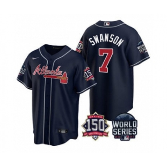 Men's Atlanta Braves #7 Dansby Swanson 2021 Navy World Series With 150th Anniversary Patch Cool Base Baseball Jersey
