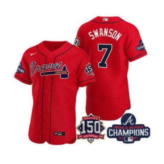 Men's Atlanta Braves #7 Dansby Swanson 2021 Red World Series Champions With 150th Anniversary Flex Base Stitched Jersey
