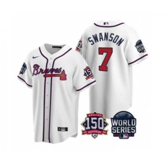 Men's Atlanta Braves #7 Dansby Swanson 2021 White World Series With 150th Anniversary Patch Cool Base Baseball Jersey