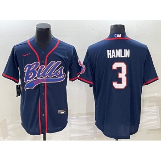>Men's Buffalo Bills #3 Damar Hamlin Navy Blue With Patch Cool Base Stitched Baseball Jersey