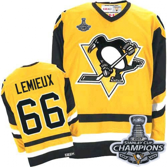 Men's CCM Pittsburgh Penguins #66 Mario Lemieux Authentic Yellow Throwback 2017 Stanley Cup Champions NHL Jersey