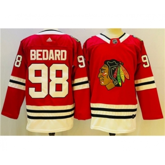 >Men's Chicago Blackhawks #98 Connor Bedard Red Black Stitched Jersey