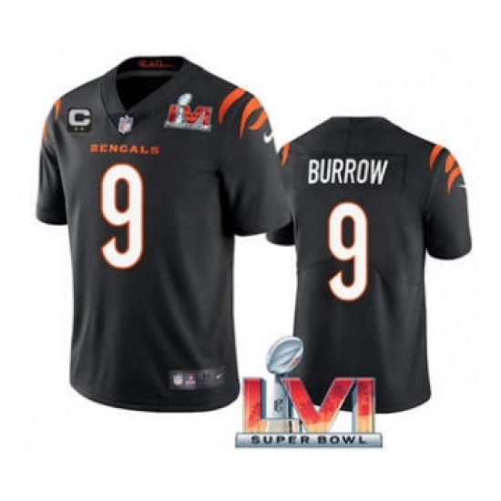 Men's Cincinnati Bengals #9 Joe Burrow 2022 Black With C Patch Super Bowl LVI Vapor Limited Stitched Jersey