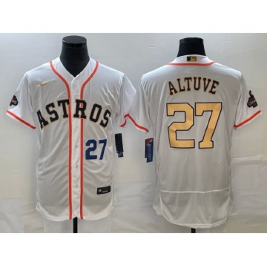 >Men's Houston Astros #27 Jose Altuve Number 2023 White Gold World Serise Champions Flex Base Stitched Jersey1