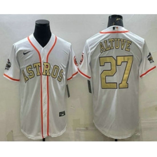 >Men's Houston Astros #27 Jose Altuve White Gold 2022 World Series Champions Stitched Cool Base Nike Jersey