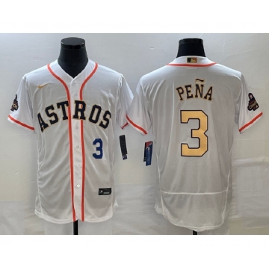 Men's Houston Astros #3 Jeremy Pena Number 2023 White Gold World Serise Champions Flex Base Stitched Jersey