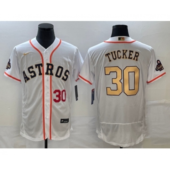 >Men's Houston Astros #30 Kyle Tucker Number 2023 White Gold World Serise Champions Flex Base Stitched Jersey2