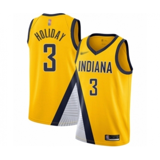 >Men's Indiana Pacers #3 Aaron Holiday Authentic Gold Finished Basketball Jersey - Statement Edition