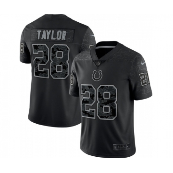 >Men's Indianapolis Colts #28 Jonathan Taylor Black Reflective Limited Stitched Football Jersey