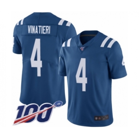 Men's Indianapolis Colts #4 Adam Vinatieri Royal Blue Team Color Vapor Untouchable Limited Player 100th Season Football Jersey