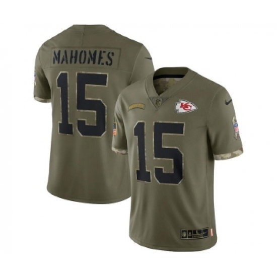 >Men's Kansas City Chiefs #15 Patrick Mahomes 2022 Olive Salute To Service Limited Stitched Jersey