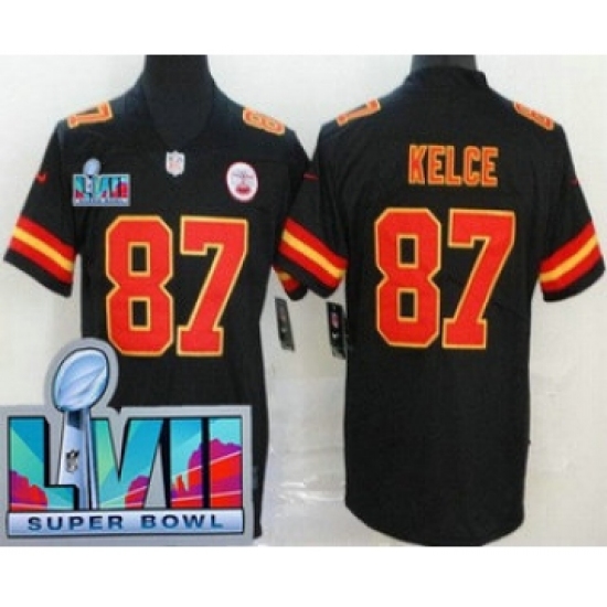 >Men's Kansas City Chiefs #87 Travis Kelce Limited Black Super Bowl LVII Vapor Jersey
