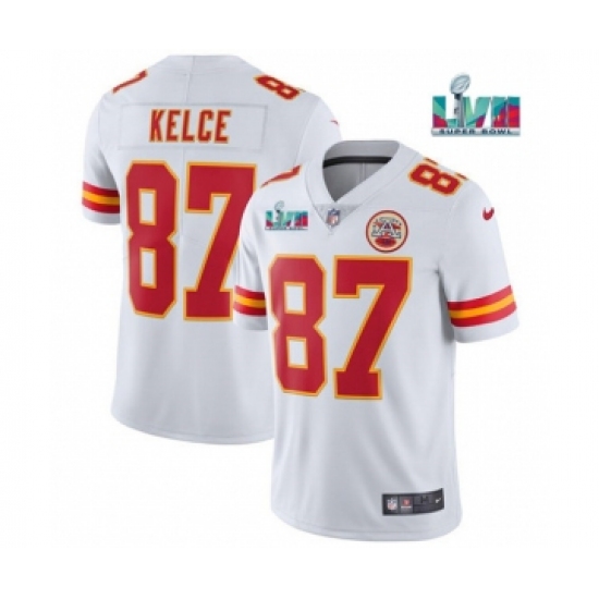 >Men's Kansas City Chiefs #87 Travis Kelce White Super Bowl LVII Patch Vapor Untouchable Limited Stitched Jersey