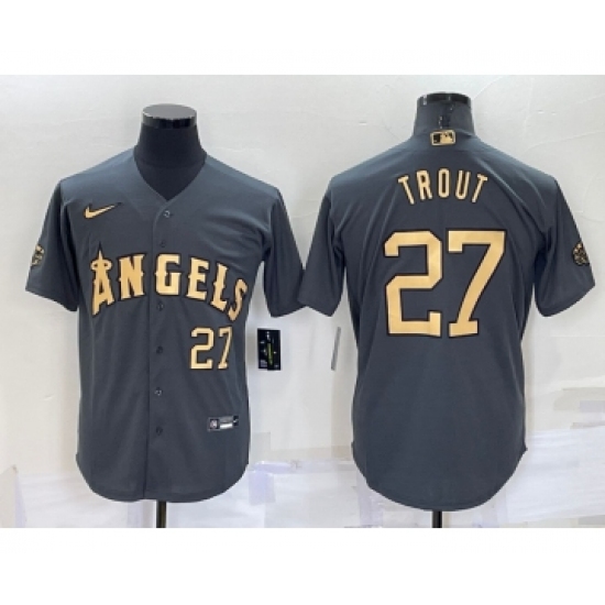>Men's Los Angeles Angels #27 Mike Trout Number Grey 2022 All Star Stitched Cool Base Nike Jersey