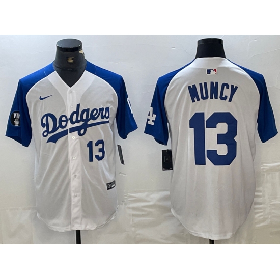 >Mens Los Angeles Dodgers #13 Max Muncy Number White Blue Fashion Stitched Cool Base Limited Jersey