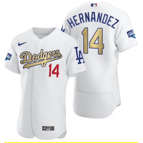 >Men's Los Angeles Dodgers #14 Enrique Hernandez Olive Gold 2020 World Series Champions Authentic Jersey