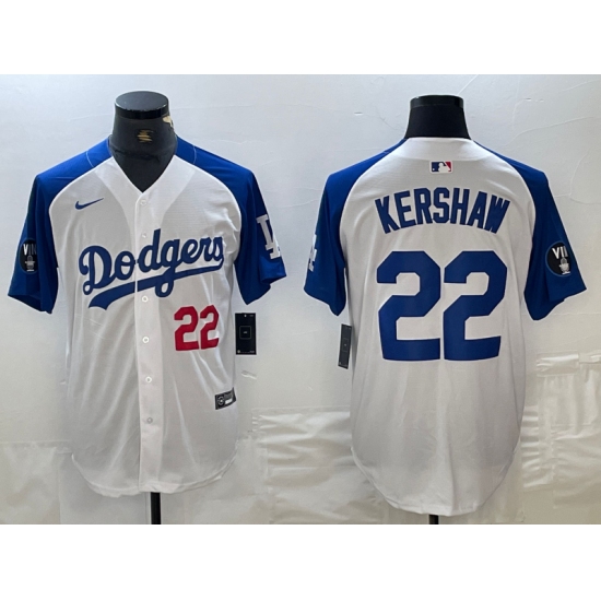 Mens Los Angeles Dodgers #22 Clayton Kershaw Number White Blue Fashion Stitched Cool Base Limited Jersey