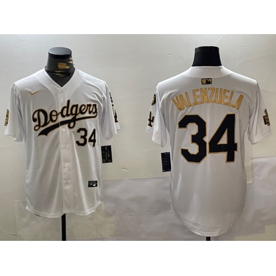 >Men's Los Angeles Dodgers #34 Toro Valenzuela White Gold 2024 World Series With Fernando Memorial Limited Stitched Baseball Jerseys