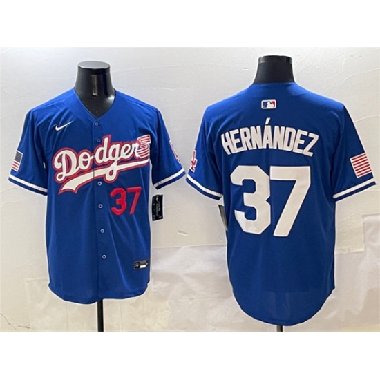 >Men's Los Angeles Dodgers #37 Teoscar Hernández Royal With American Flag Limited Stitched Baseball Jersey