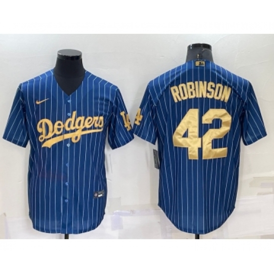 Men's Los Angeles Dodgers #42 Jackie Robinson Navy Blue Gold Pinstripe Stitched MLB Cool Base Nike Jersey