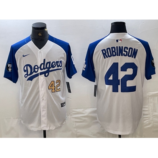 >Mens Los Angeles Dodgers #42 Jackie Robinson Number White Blue Fashion Stitched Cool Base Limited Jersey