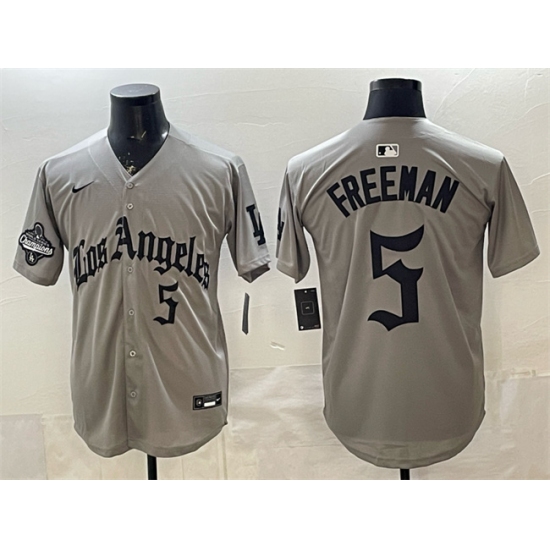 >Men's Los Angeles Dodgers #5 Freddie Freeman Grey LA Gothic Style With 2025 World Series Champions Limited Stitched Baseball Jersey