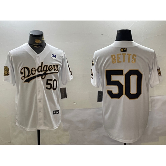 Mens Los Angeles Dodgers #50 Mookie Betts White Gold 2024 World Series With Fernando Memorial Limited Stitched Baseball Jersey