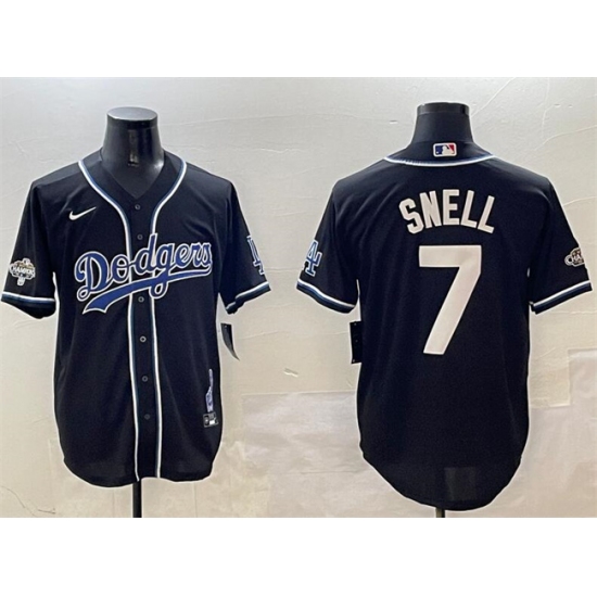 >Mens Los Angeles Dodgers #7 Blake Snell Black 2024 World Series Champions Cool Base Stitched Baseball Jersey
