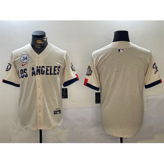 Men's Los Angeles Dodgers Blank Cream 2024 World Series With No. 34 Limited Stitched Baseball Jersey