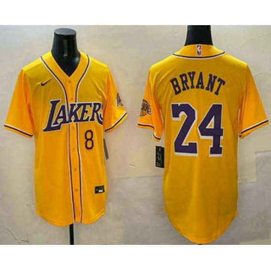 Men's Los Angeles Lakers #8 24 Kobe Bryant Yellow Purple With Cool Base Stitched Baseball Jersey