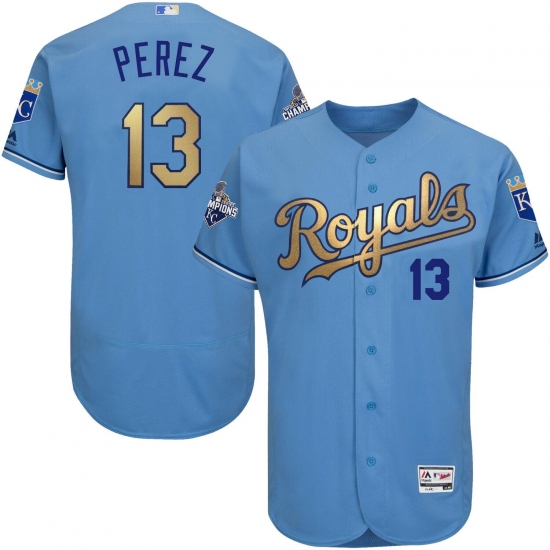 Home>MLB>Kansas City Royals>Salvador Perez>Men's Majestic Kansas City Royals #13 Salvador Perez Authentic Light Blue 2015 World Series Champions Gold Program FlexBase MLB Jersey