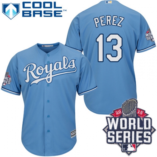 Home>MLB>Kansas City Royals>Salvador Perez>Men's Majestic Kansas City Royals #13 Salvador Perez Authentic Light Blue Alternate 1 Cool Base 2015 World Series