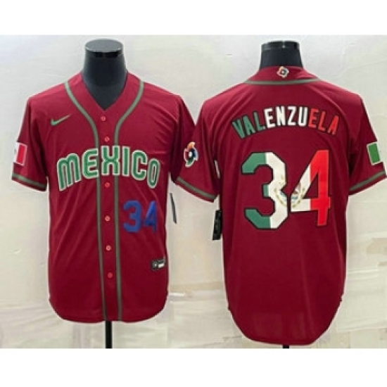 Mens Mexico Baseball #34 Fernando Valenzuela Number 2023 Red Blue World Baseball Classic Stitched Jersey