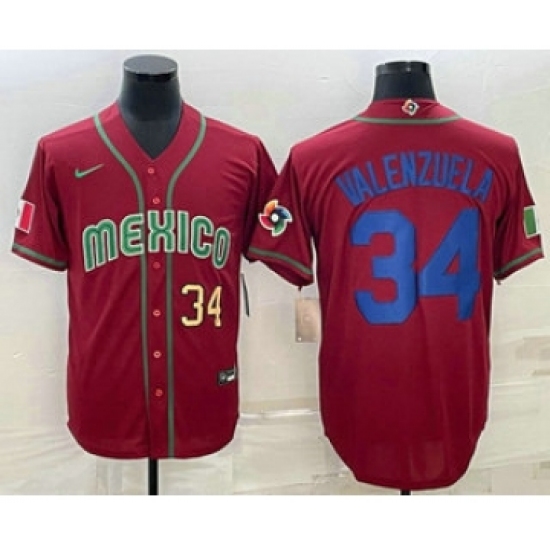 >Men's Mexico Baseball #34 Fernando Valenzuela Number 2023 Red Blue World Baseball Classic Stitched Jersey2