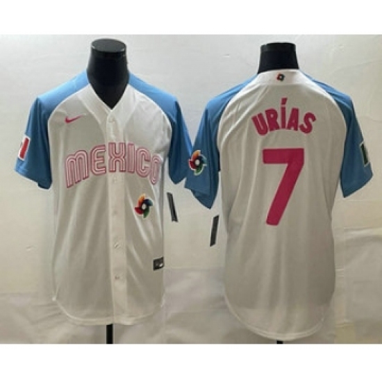 >Men's Mexico Baseball #7 Julio Urias 2023 White Blue World Classic Stitched Jersey