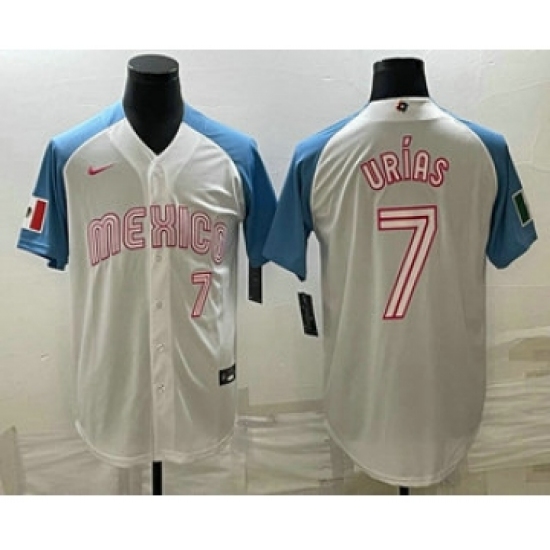 >Men's Mexico Baseball #7 Julio Urias Number 2023 White Blue World Classic Stitched Jersey2