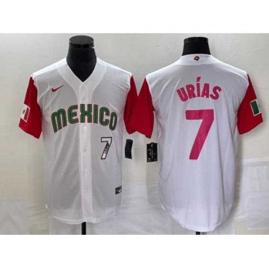 >Men's Mexico Baseball #7 Julio Urias Number 2023 White Red World Classic Stitched Jersey 29