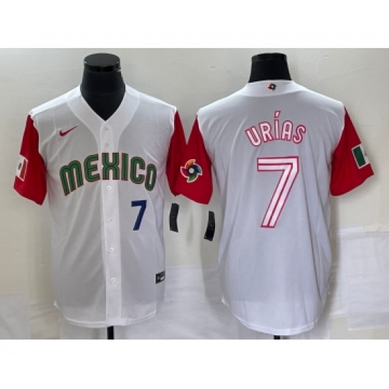 >Men's Mexico Baseball #7 Julio Urias Number 2023 White Red World Classic Stitched Jersey 44