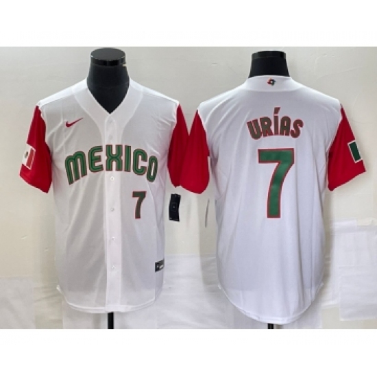 >Men's Mexico Baseball #7 Julio Urias Number 2023 White Red World Classic Stitched Jersey 55