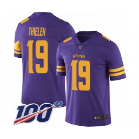 >Men's Minnesota Vikings #19 Adam Thielen Limited Purple Rush Vapor Untouchable 100th Season Football Jersey