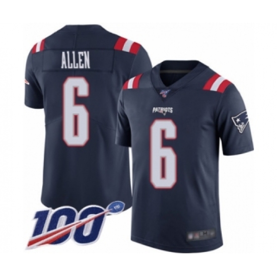 >Men's New England Patriots #6 Ryan Allen Limited Navy Blue Rush Vapor Untouchable 100th Season Football Jersey